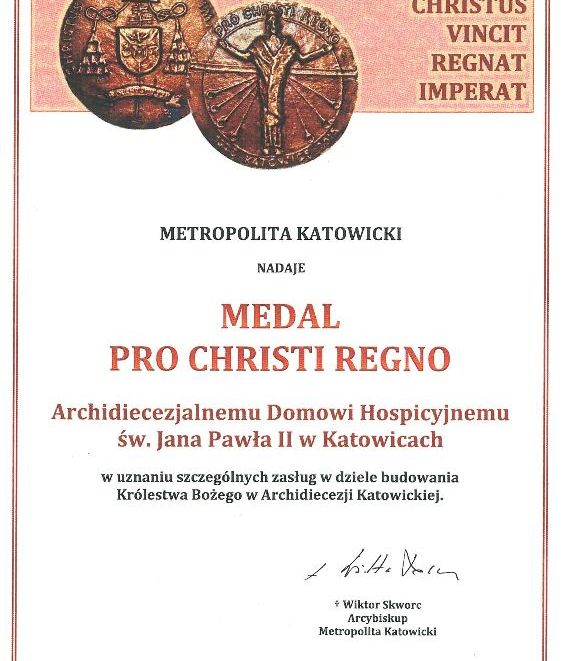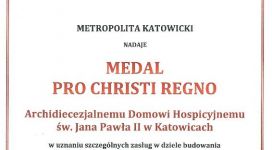 W uroczystość Jezusa Chrystusa Króla Wszechświata, tj. w niedziele 20 listopada 2016 r., Ksiądz Arcybiskup Metropolita Katowicki Wiktor Skworc nadał Archidiecezjalnemu Domowi Hospicyjnemu św. Jana Pawła II w Katowicach medal "Pro Christi Regno".Medal ten został przyznany:" w uznaniu szczególnych zasług w budowaniu Królestwa Bożego w Archidiecezji Katowickiej."